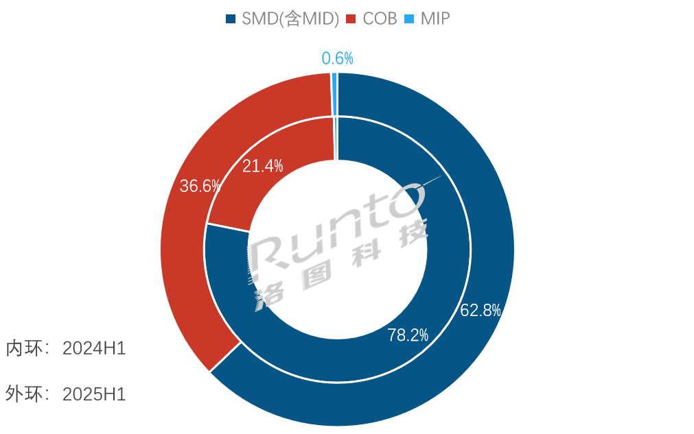 패키징 기술 경로면에서 COB와 전통적인 SMD의 경쟁 구도는 변화하고 있음. RUNTO 데이터에 따르면, 2025년 상반기 COB 패키징 기술 제품의 매출액 점유율은 36.6%에 달해 전년 동기 대비 15.2%p 상승했음. 특히 기술 장벽이 더 높은 P1.4 및 그 이하 피치 구간에서 COB의 우위는 더욱 뚜렷하여, 시장 매출액 점유율이 절반을 넘어 51.5%에 달함. 이는 전년 동기 대비 19.5% 포인트 급증한 수치임.