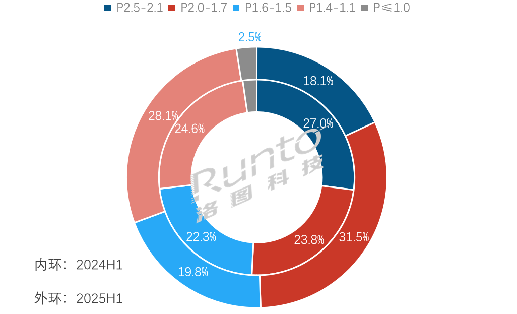 <2025 상반기 중국 대륙 스몰피치 LED 디스플레이 시장 출하 면적별 피치 제품 구조 및 변화>