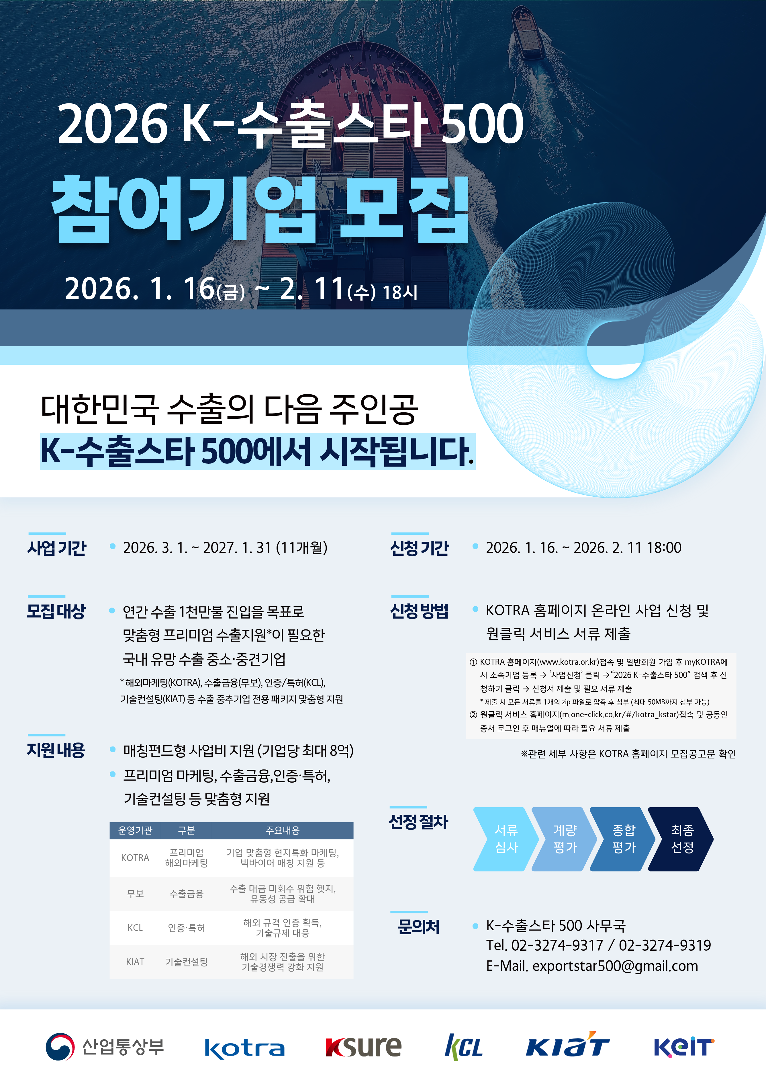 → “2026 K-수출스타 500” 검색 후 신청하기 클릭 → 신청서 제출 및 필요 서류 제출