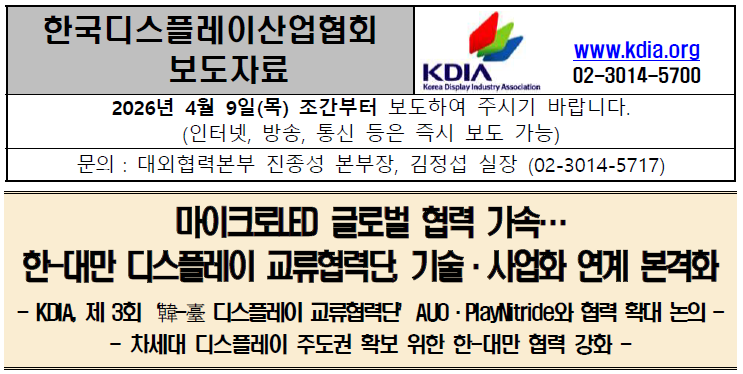 [보도자료] 디스플레이協, 대만과 마이크로 LED 분야 협력 네트워크 강화